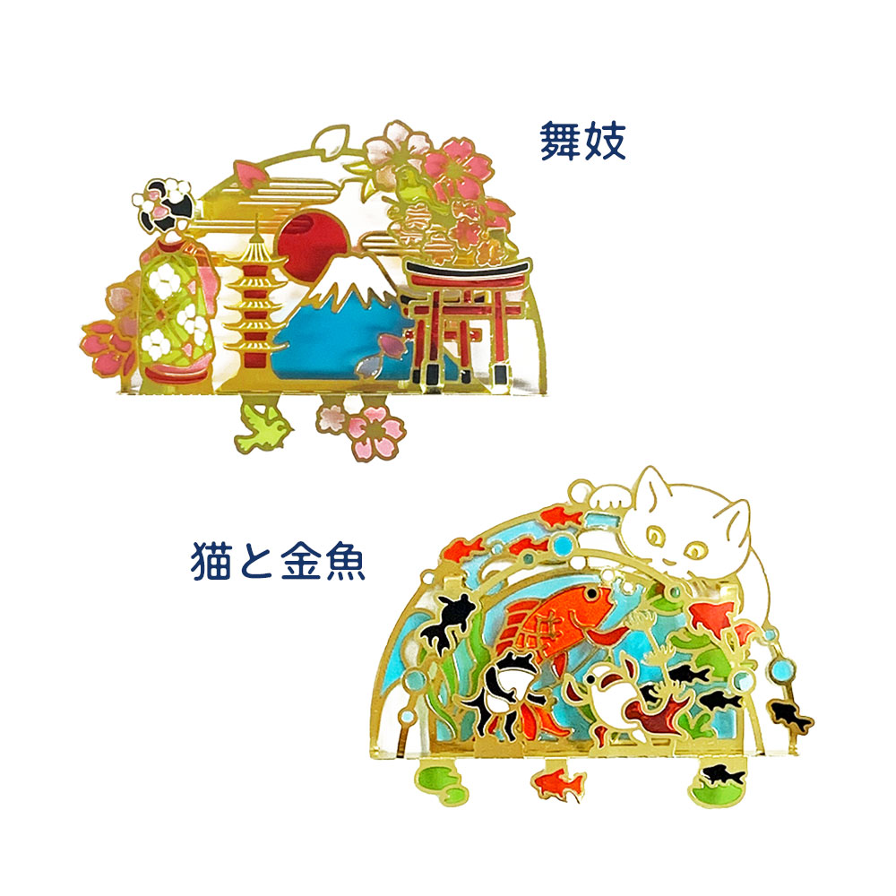 | サイズ | 約W70×D12×H65mm 富士山と桜 約W80×D12×H53mm 招き猫 約W72×D12×H57mm 猫と金魚 約W75×D12×H55mm 舞妓 |